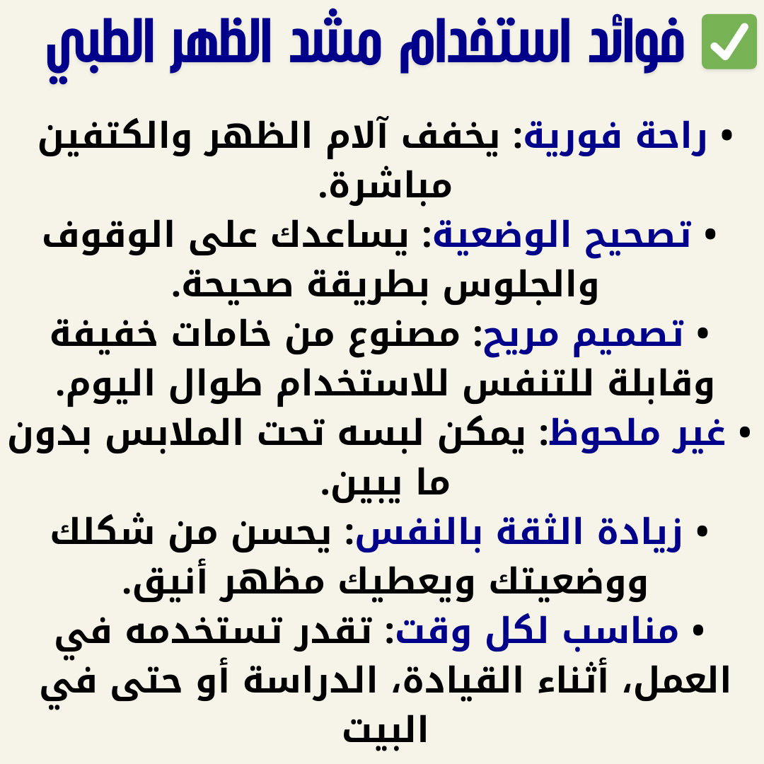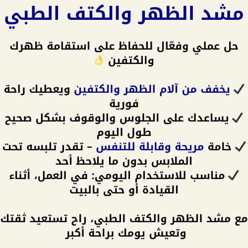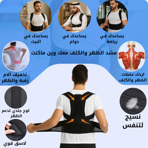 مشد الظهر والكتف هو الحل الأمثل يحافظ لك على استقامة ظهرك ويريّح كتافك 💪 مناسب للي يجلسون وقت طويل أو يشتغلون على مكتب. خل ظهرك وكتافك يرتاحون وتمتع بأفضل وضعية لجسمك. المنتج ما يجي بمقاس محدد، تقدر تعدله على مقاسك، ويناسب كل مقاسات